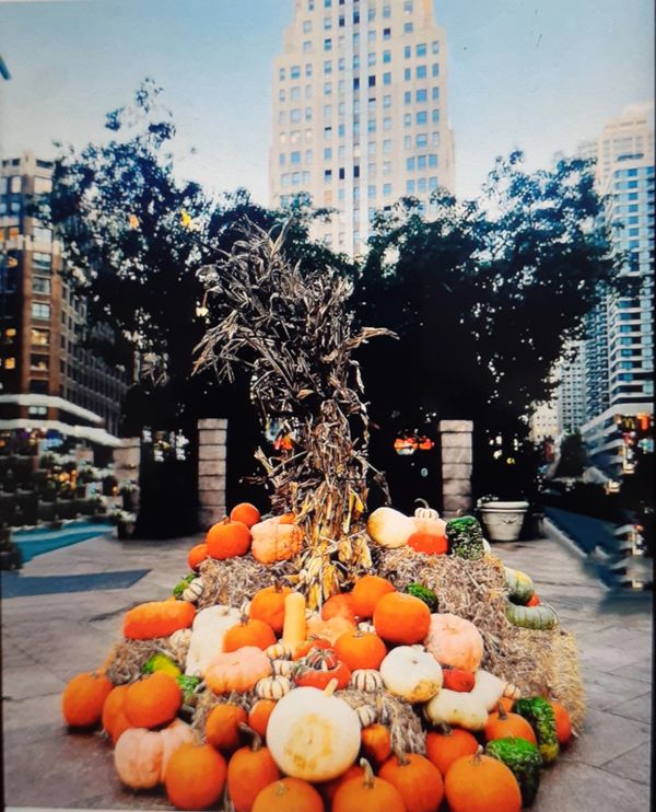 This work of art caught my attention because of the different details. This was displayed in Herald Square, Manhattan. The pumpkins remind me of Halloween with a twist of Thanksgiving. As you look closer, there is snow around it as well. Leaving the fall season coming into winter is amazing. I think this caught just that! Léah